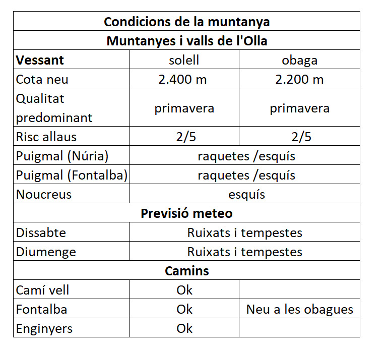 El risc d’allau és de 2 sobre 5 enfocant-se al migdia i a les allaus de neu humida degut a la manca de regel i pluges en totes les cotes. Cal dur sempre el DVA la pala i la sonda i haver fet pràctiques de rescat. De bon matí el risc és més baix pel factors temperatura de la neu. Això vol dir que durem els elements de seguretat per evitar caigudes i/o poder fer auto-detenció com són els grampons, el piolet i el casc; i les ganivetes si aneu amb esquís.