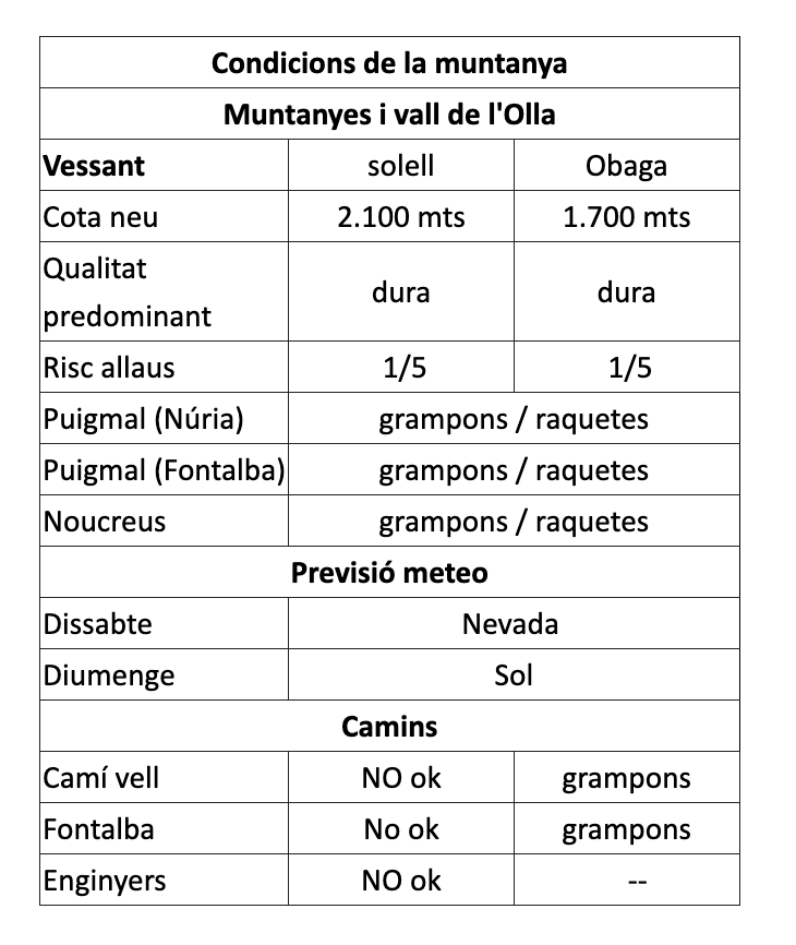 Pel camí de Fontalba amb la nevada prevista de dissabte en cota baixa, no podrem pujar gaire amunt amb cotxe. De Fontalba a Núria trobarem neu en tot el camí. Dur raquetes i/o uns grampons flexibles a la motxilla ens permetrà passar amb seguretat per les zones amb més dificultat. Només per a persones amb experiència hivernal. Atenció al ris d’allaus que travessa vessants exposats a les allaus.