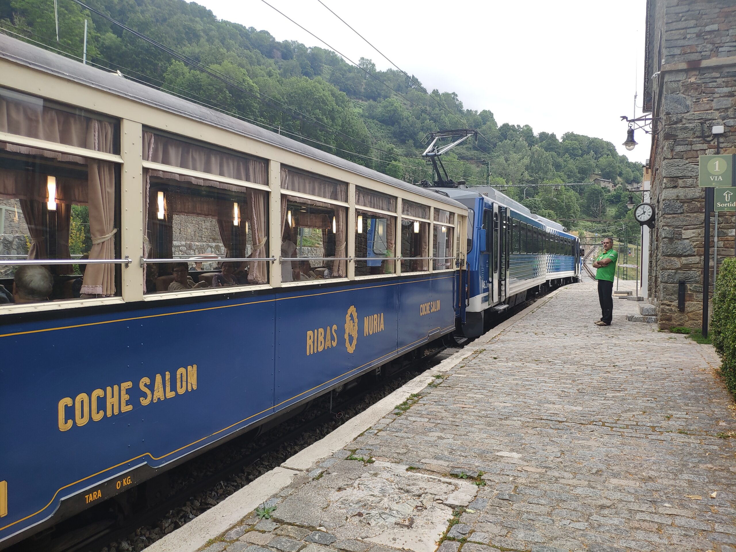 Fer el trajecte de Ribes-Vila a Núria amb el cotxe saló és una experiència inoblidable, gairebé com endinsar-te en una altra època. Aquest vagó especial està decorat amb materials nobles, al seu interior disposa només de 18 comodíssimes butaques que permeten observar més bé el paisatge, sent aquest un viatge exclusiu. Durant el viatge es serveixen pastes amb cava, i el guia explica detalladament els principals punts del recorregut.