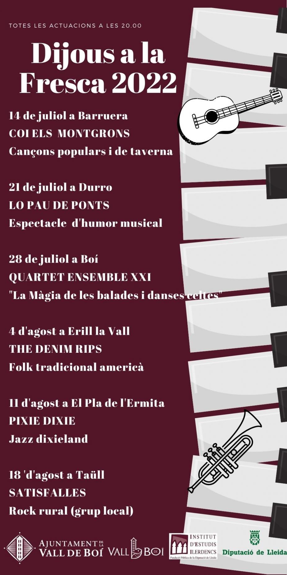 A partir del proper 14 de juliol i fins a la penúltima setmana d’agost, la Vall de Boí convida les famílies i visitants a descobrir els seus racons al compàs de diferents estils musicals amb el cicle dels Dijous a la Fresca, que aquest any 2022 celebra la 29a edició. Us animem a acompanyar-nos i a gaudir de la música de diferents estils i del nostre entorn.