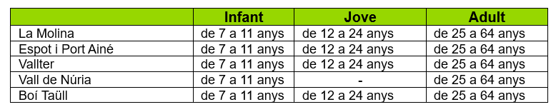 Franges d’edat d’aplicació dels forfets de dia o diversos dies: