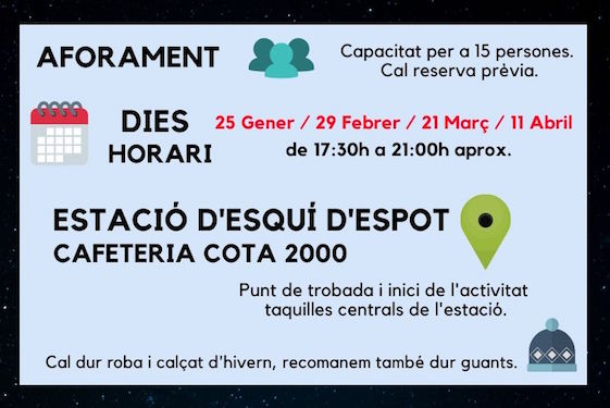 In October 2018, the Parc Nacional d’Aigüestortes i Estany de Sant Maurici obtained this certification. Therefore, together with the Park we have placed a star observation table at the 2000 level of the Espot station , so that we can all enjoy individually or with the activities already prepared.