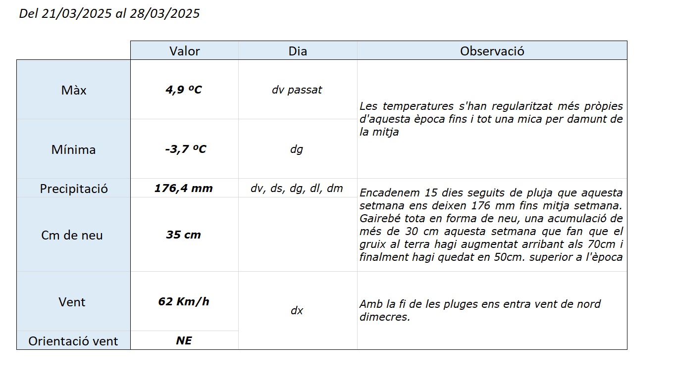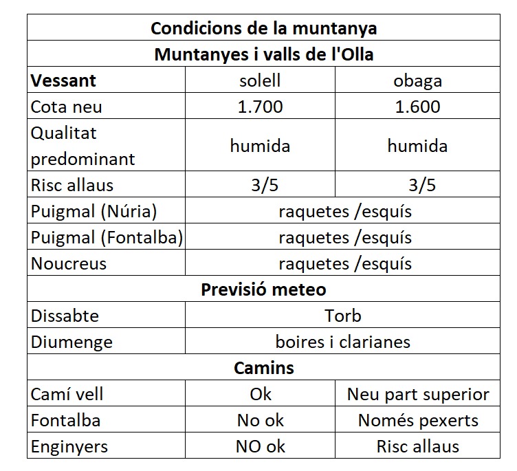 Tenemos el Pirineo oriental con enu en su totalidad. Probablemente sea el momento con más nieve de los últimos años. Nieve a partido de los 1.700 mts con unos 50cm a los 2.000mts y más de 1mts en las cotas altas. La cantidad de nieve acumulada y el viento previsto para el sábado hacen que el riesgo de aludes esté a nivel 3 sobre 5. Es momento de ser prudentes y elegir muy bien el trazado de los itinerarios; con la acumulación actual los aludes pueden ser de gran tamaño. También se prevé una entrada de viento que formará nuevas placas en diferentes orientaciones S. Toda la información la encontrará en el Boletín de Peligro de aludes. El sábado no se recomienda realizar actividades en alta montaña. Es necesario llevar la pala el DVA y la sonda.