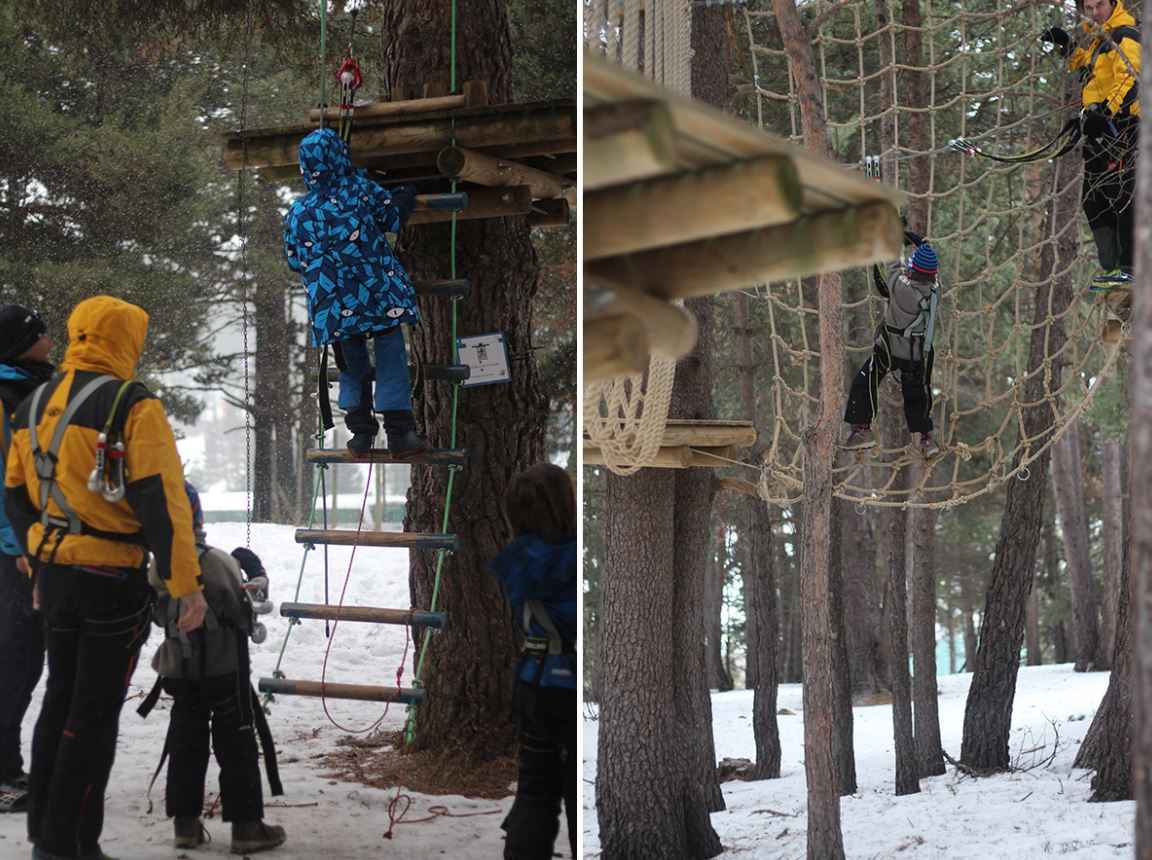 Los recorridos propuestos tienen la misma señalización de las pistas: del verde al rojo. Nosotros probamos el circuito azul y pudimos disfrutar tanto niños como adultos de la adrenalina de atravesar puentes tibetanos entre los árboles, lanzarse en tirolinas y hasta escalar un poquito. Una gozada para estirarse después del esquí y disfrutar del entorno… tuvimos además la suerte de que nos empezó a nevar.