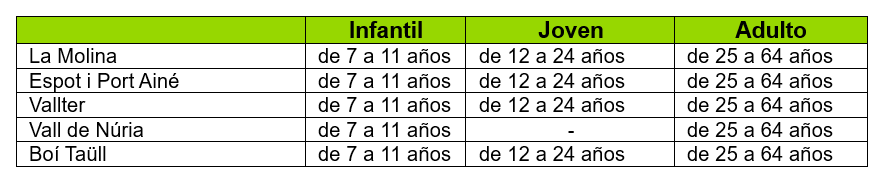 - Clubs: acreditación de que el titular es socio. Cada estación puede exigir complementariamente la presentación de documentación que acredite la vigencia de esta condición en la fecha de expedición del forfait.