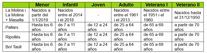 Franjas de edad de aplicación de los forfait de día o varios días: